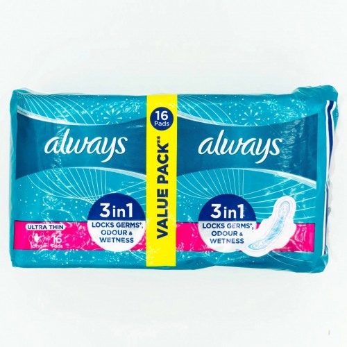 Always 3-in-1 Ultra Thin (Long) Sanitary Pads, 16 Ct