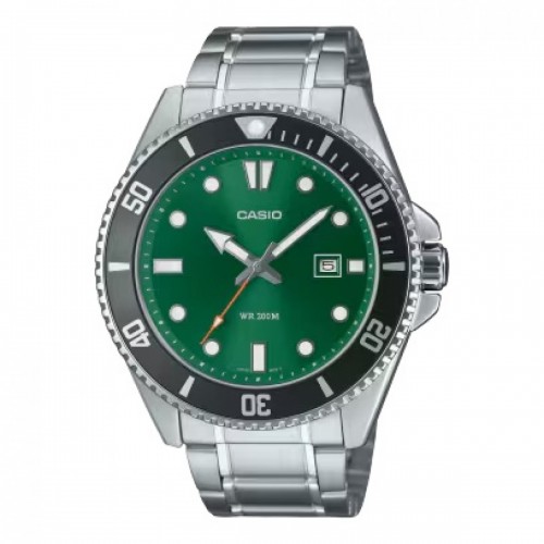 The Casio MDV-107D-3A2 is a sophisticated yet rugged timepiece, designed for men who appreciate a bold and versatile watch. Featuring a sleek black dial with contrasting green accents, this stainless steel watch combines a refined look with durable functionality. Its diver-inspired design, complete with a rotating bezel and luminous markers, ensures easy readability and a stylish presence on the wrist.