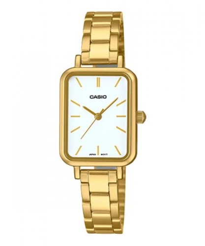 The Casio LTP-V009G-7E is a charming and elegant women's dress watch, designed with a petite rectangular case and a refined gold-tone stainless steel band. Its clean white dial features simple, gold-tone markers that provide both style and functionality. Ideal for formal occasions or adding a touch of class to everyday wear, this timepiece combines timeless elegance with reliable performance.
