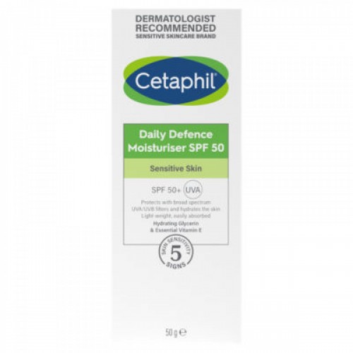 Cetaphil Daily Defence Moisturiser SPF 50+ provides superior hydration and broad-spectrum sun protection in one step. Designed for sensitive skin, this lightweight formula shields against harmful UVA and UVB rays, helping to prevent premature aging and sun damage. Its non-greasy, fast-absorbing texture makes it ideal for daily use, leaving the skin soft, smooth, and moisturized without clogging pores. Dermatologically tested, this moisturizer ensures optimal care for all skin types, even the most delicate. Perfect for maintaining a healthy and protected complexion.