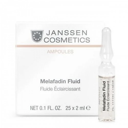 Janssen Cosmetics Melafadin Fluid (25x2ml) is a powerful treatment designed to address hyperpigmentation and uneven skin tone. This intensive fluid contains active ingredients that target dark spots, age spots, and other types of pigmentation, helping to lighten and brighten the skin. With its concentrated formula, Melafadin Fluid works to reduce the appearance of discoloration and provide a more even and radiant complexion.