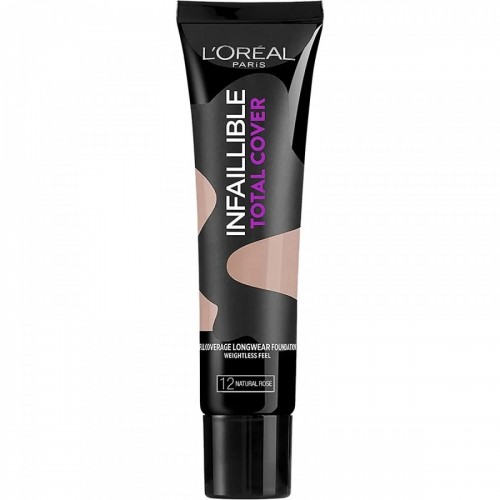 L'Oreal Infallible Total Cover Foundation in Shade 12 Natural Rose provides full, high-coverage that conceals imperfections, blemishes, and redness while offering a natural finish. The formula delivers a smooth, flawless complexion that lasts up to 24 hours, making it ideal for those who need long-lasting coverage and a comfortable wear.
