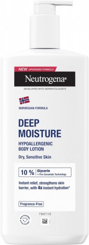 Neutrogena Deep Moisture Hypoallergenic Body Lotion, available in a 400ml bottle, is designed for dry and sensitive skin. It is formulated with dermatologists to deliver deep and long-lasting hydration, providing comfort and softness for up to 48 hours. The fragrance-free and hypoallergenic lotion absorbs quickly, leaving skin feeling smooth and protected without a greasy residue.