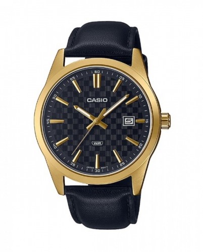 The Casio MTP-VD03GL-1A is a sleek and stylish analog timepiece designed for mens who appreciate a classic, timeless look. Featuring a bold black dial with clear white hour markers and hands, this watch offers excellent readability while maintaining a minimalist design. The black leather strap provides comfort and a sophisticated touch, complementing the stainless steel case for added durability. Powered by quartz movement, this watch ensures reliable timekeeping for everyday use.