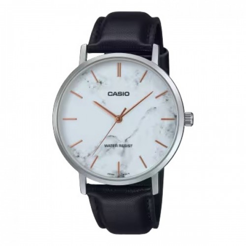 Casio Standard Analog Black Leather Strap Marble Inspired White Dial Quartz MTP-VT01LM-7A Mens Watch