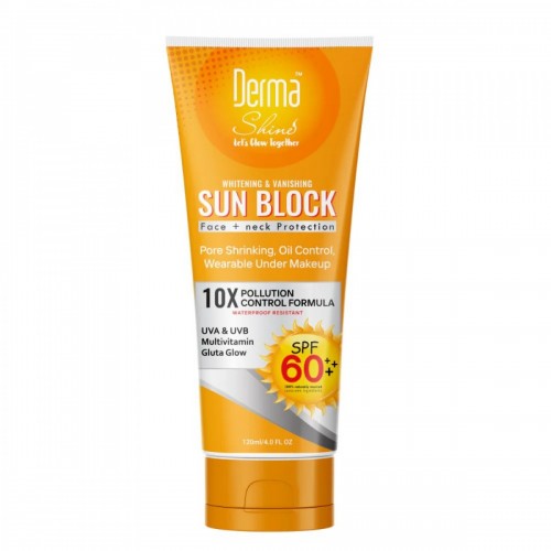 Derma Shine Sunblock SPF 60 Face & Neck - 120ml provides high-level protection against harmful UV rays, preventing sunburn, premature aging, and pigmentation. Formulated with a broad-spectrum SPF 60, it shields the skin from both UVA and UVB rays while hydrating and soothing the skin. Ideal for daily use, this sunblock ensures your face and neck remain protected, radiant, and youthful throughout the day.