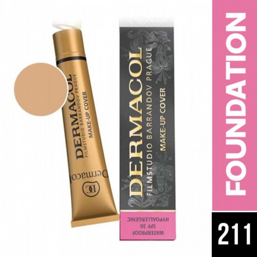 Apply Dermacol Makeup Cover Foundation SPF30 - 211 using a foundation brush or sponge, blending evenly onto the skin.