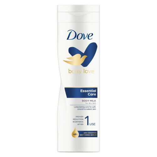 Dove Body Love Essential Care Body Lotion (250ml) is designed to provide dry skin with deep and long-lasting moisture. It contains a Ceramide Restoring Serum that helps strengthen the skin's natural moisture barrier, preventing moisture loss and leaving skin feeling soft, smooth, and radiant. The lotion is dermatologically tested and suitable for all skin types.