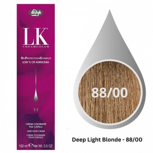 LK Cream Color 88/00 Deep Light Blonde is a premium permanent hair color that provides an intense, natural-looking deep light blonde shade. Perfect for those who desire a radiant, long-lasting blonde with enhanced depth, this professional formula offers 100% gray coverage while maintaining the hair's softness and shine.