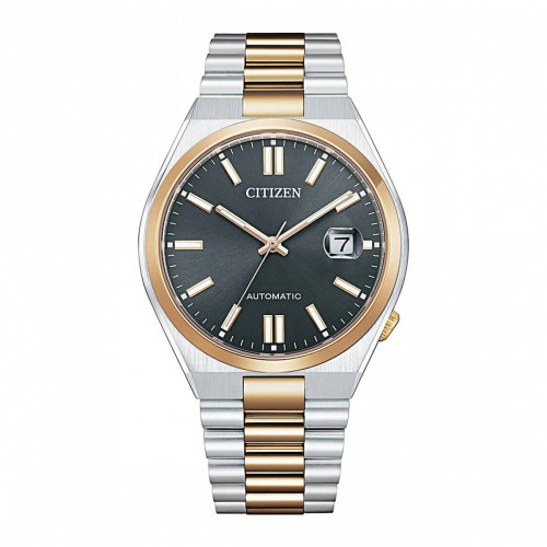The Citizen NJ0154-80H is a "Tsuyosa" automatic mechanical watch with a 40mm stainless steel case, a black sunray dial, and a two-tone stainless steel bracelet with gold-tone accents. It features a self-winding Citizen caliber 8210 movement, a date window, a durable sapphire crystal, and 50 meters of water resistance, making it suitable for daily wear.
