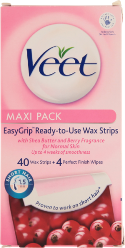 Veet Easy Grip Wax Strips with Shea Butter & Berry (20 Strips) are ready-to-use waxing strips designed for normal skin. Enriched with moisturizing shea butter and a fruity berry fragrance, they remove hair from the root—even as short as 1.5 mm—leaving skin smooth for up to 4 weeks. The Easy Grip™ tab ensures quick and effective hair removal, and the pack includes 4 Perfect Finish Wipes for a clean, residue-free finish.